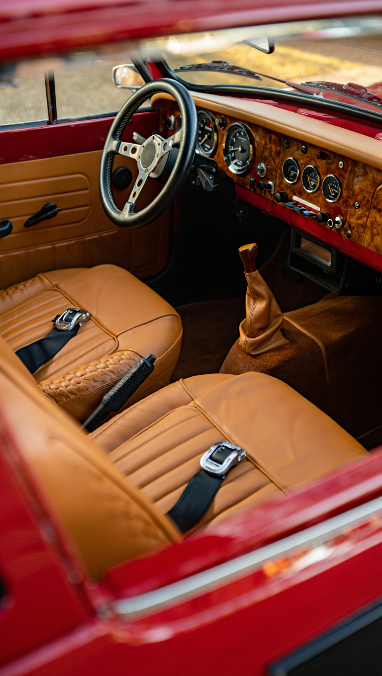 A Ferrari sports car positioned in a spacious industrial garage interior,