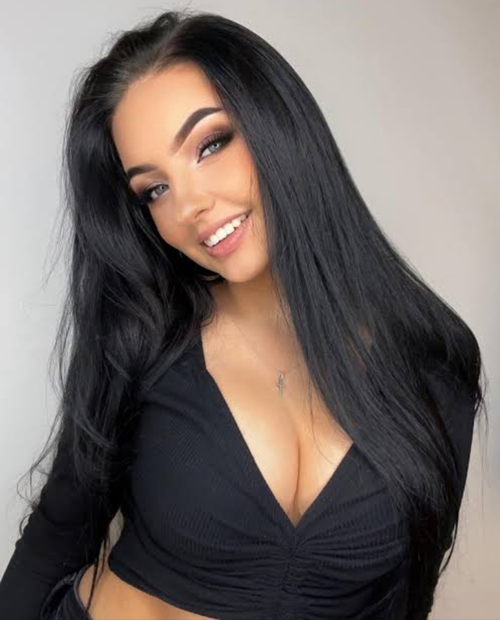 A professional fashion photograph captures a young female model in a black designer cutout swimsuit and black platform heels against a pristine white Mediterranean villa wall. The model strikes a dramatic pose with one hand on her hip and leg extended, displaying long black hair falling past her shoulders and expertly applied makeup including smoky eyes and nude lips. Behind the model, a stunning coastal landscape reveals emerald green mountains descending to azure blue waters at the horizon. Natural daylight bathes the scene, highlighting the textured white stucco wall surface and creating defined shadows. The low-angle medium shot frames the model from knees to head, emphasizing her confident pose against the luxury resort setting of stone pathways and terraced gardens visible in the background. Low-angle fashion photography with natural daylight and sharp focus on both subject and architectural elements.