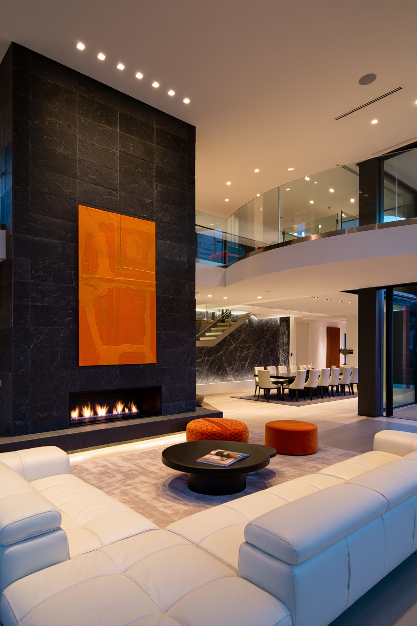An architectural rendering of a minimalist bedroom features a dark wood platform bed with light gray bedding, a white marble wall with subtle gray veining, a large window with sheer white curtains and a city view, a black leather lounge chair, black metal side tables with modern white lamps, and a textured off-white rug. The image is captured from a wide-angle perspective, showcasing the full room layout with a deep depth of field.