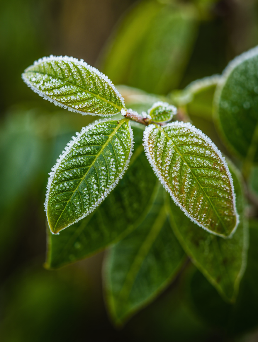 A detailed macro photograph captures morning dew drops on a pink flower petal. Individual water droplets of varying sizes cling to the petal's surface, each droplet reflecting and refracting light. The petal displays intricate cellular texture and venation patterns visible through the transparent drops. The background features a radial blur effect with soft, out-of-focus tropical foliage creating depth. The composition is centered on the water drops, with smooth transitions between focused and blurred areas. Extreme close-up macro photography with shallow depth of field and natural lighting.