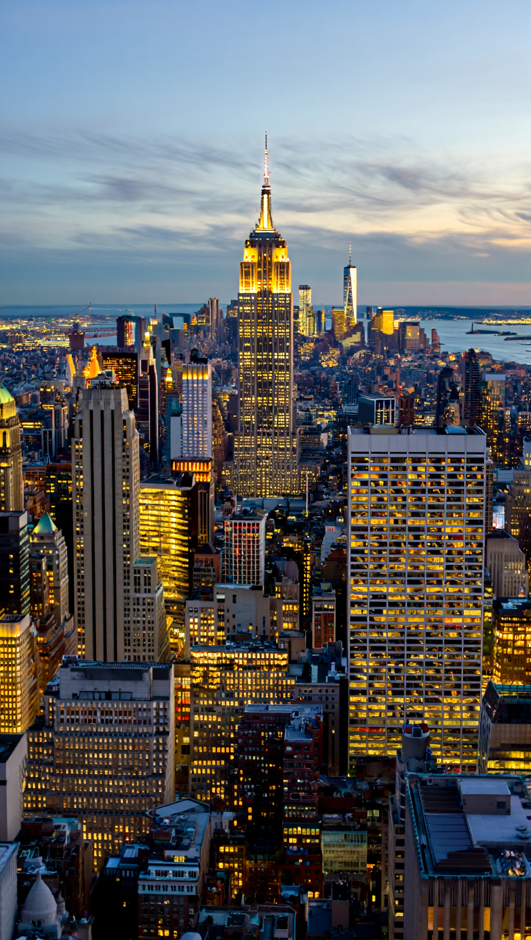 A dramatic urban photograph captured in Manhattan features the iconic Chrysler Building framed by modern office towers