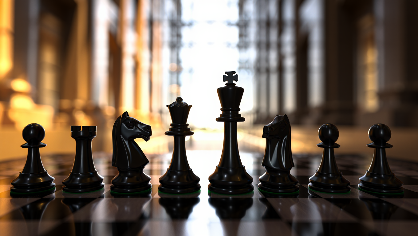 A close-up, low-angle 3D rendered photography of three ornate chess king pieces arranged on a checkered chessboard
