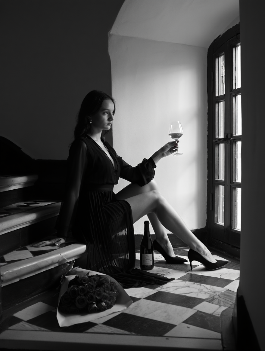 Female model in a black designer cutout swimsuit and black platform heels against a pristine white Mediterranean villa wall