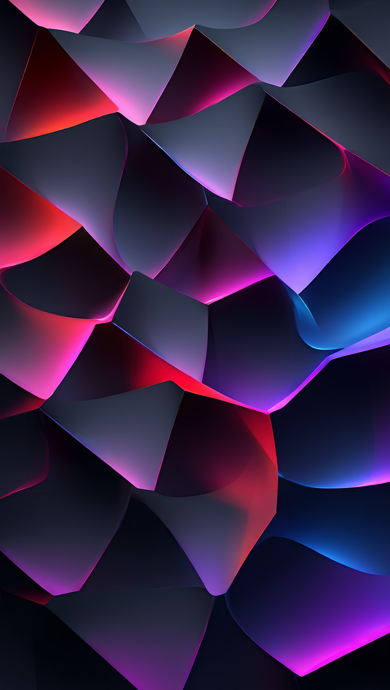 A digital abstract artwork fills a vertical frame with interweaving red and blue ribbon-like forms against a deep black space background. The translucent ribbons curve and flow through the composition, creating intricate patterns as they overlap and wrap around each other. Small white stars and luminous particles scatter across the dark cosmic void, while dramatic lighting effects and color gradients add depth to the flowing forms. The red ribbons emit a soft glow, contrasting with the cooler blue elements as they wind through the black expanse of space. High-resolution digital art with smooth gradients and precise lighting effects on a black background.