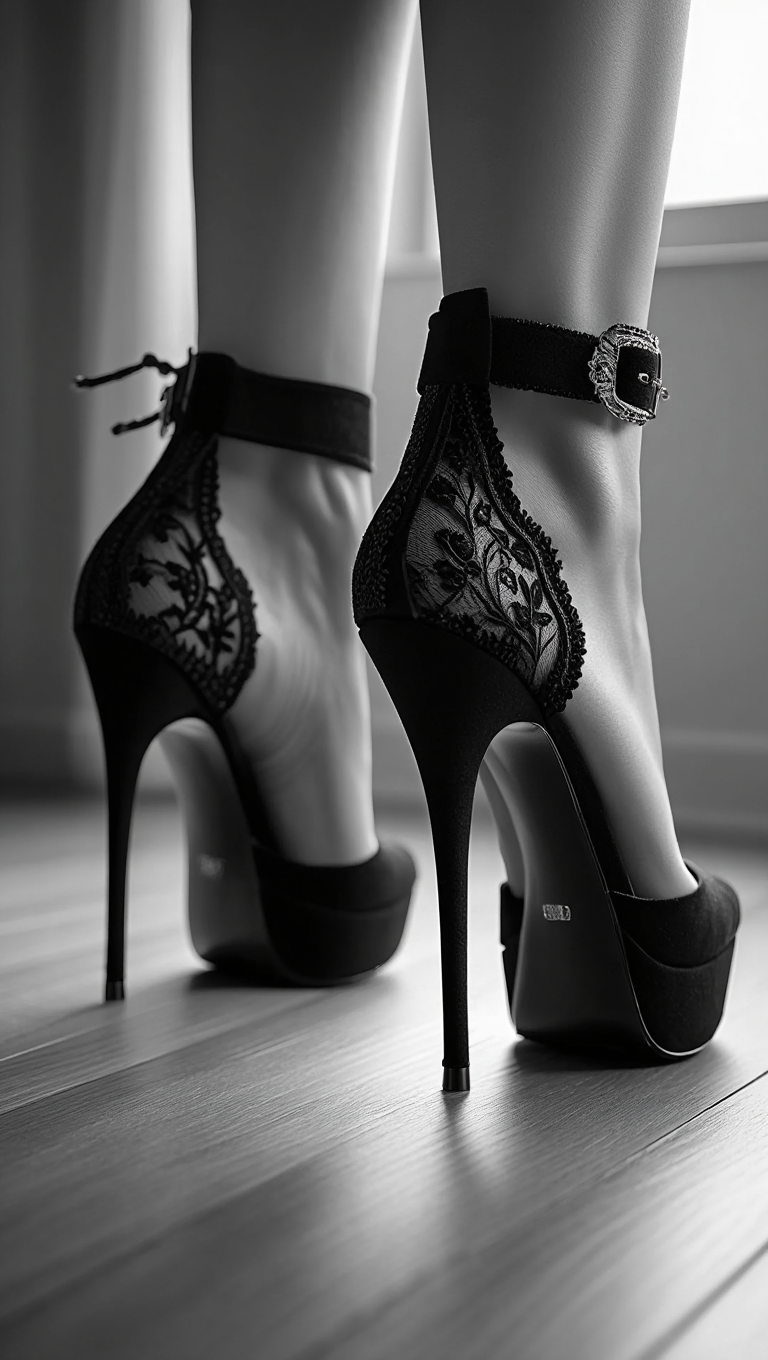 A female model wearing black sheer stockings and white lace lingerie sits at a wooden kitchen table. The model's legs are crossed at the ankles, and her hands rest on the polished wooden tabletop. The kitchen features white cabinets, stainless steel appliances, and a tile backsplash visible in the background. Natural light streams through a window above the kitchen sink, illuminating the scene. Professional fashion photography with soft natural lighting and shallow depth of field.