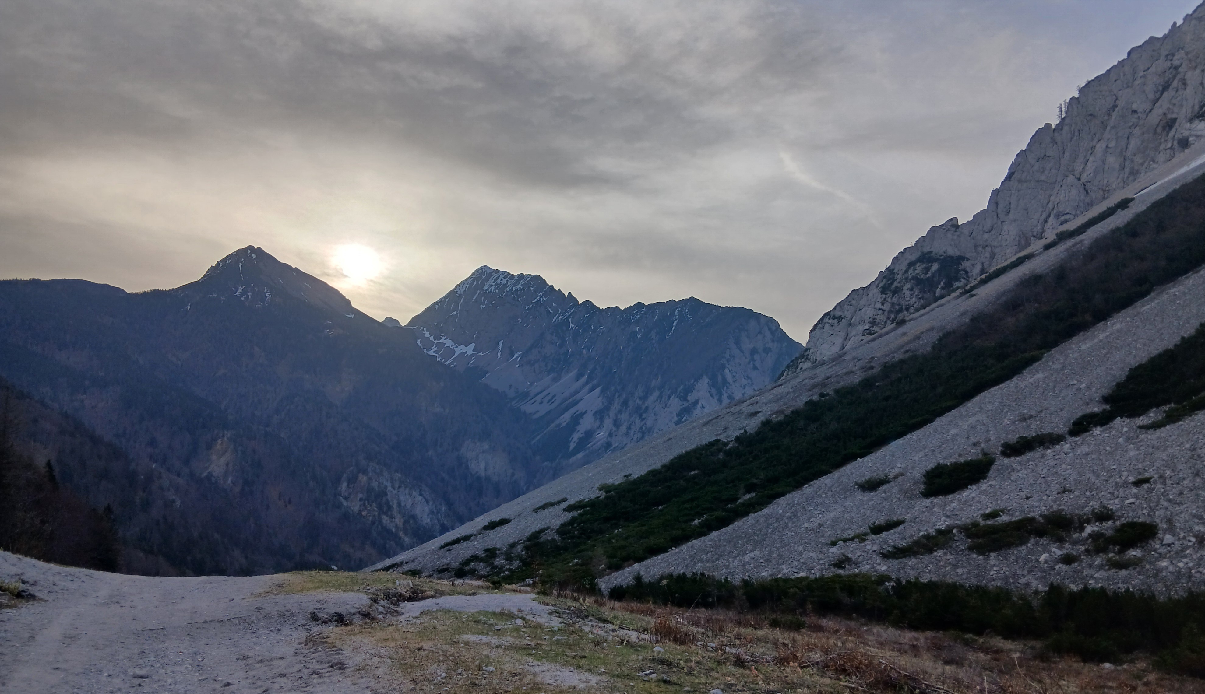 A tropical beach landscape photographed during sunset shows a pristine beige sandy beach meeting gentle turquoise ocean waves that reflect brilliant orange and pink hues from the sky. The horizon displays a dramatic color gradient transitioning from deep purple and indigo blue at the top to vibrant orange and golden yellow where the setting sun touches the ocean surface. Six tall palm trees stand silhouetted against the colorful sky, their dark green fronds moving in the coastal breeze. The ocean waves create gentle ripples along the shoreline, with white foam visible where waves meet sand. The scene captures the entire beach landscape from shore to horizon in a single frame. Wide-angle landscape photography with natural backlighting and sharp focus across the entire scene.