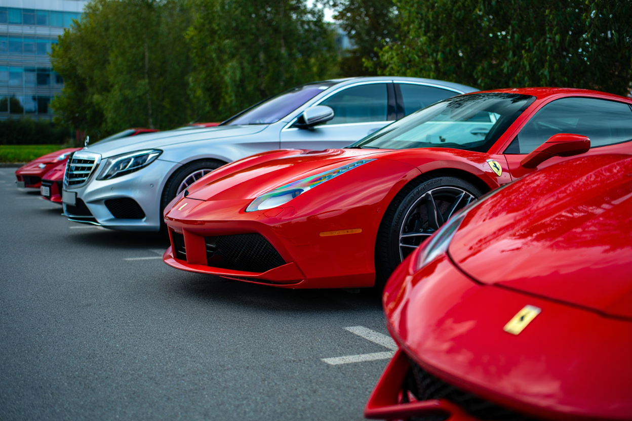 A modified BMW M4 sports car with matte black exterior paint sits low to the ground on a wet reflective surface, photographed from a low angle perspective. The car features aggressive widebody styling with extended fenders, custom black wheels, and distinctive large vertical kidney grilles illuminated in bright red lighting. Storm clouds fill the sky overhead, creating a dramatic backdrop. The wet surface beneath the car creates a perfect mirror reflection of the vehicle, while professional post-processing enhances the moody atmosphere with a cool color palette and selective red accent lighting. Low-angle automotive photography with dramatic natural lighting and professional post-processing effects.